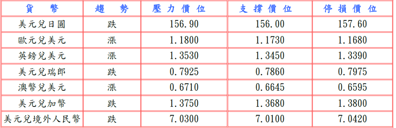 隨著前BOJ審議委員櫻井真表示進一步加息可能更具挑戰性,不僅使借貸成本接近被視為經濟中性的水平,亦引發鴿派日本首相高市早苗主張再通貨膨脹的顧問批評,但認為BOJ總裁植田和男直至2028年初的剩餘任期內再加息三次至1.5%,提供日圓支撐;此外,美國9月全國活動指數擴大跌勢至負-0.21,而且彭博報導美國聯邦準備理事會(FED)理事米蘭可能明年1月31日任期結束後繼續留任,直到總統川普提名下一任FED理事獲參議院確認,其主張降息的幅度大於多數決策者,已為FED最鴿派政策制定者,打擊美元兌日圓至156.70低點。預估今日美元兌日圓阻力於156.90-157.10,支撐於155.80-156.00。