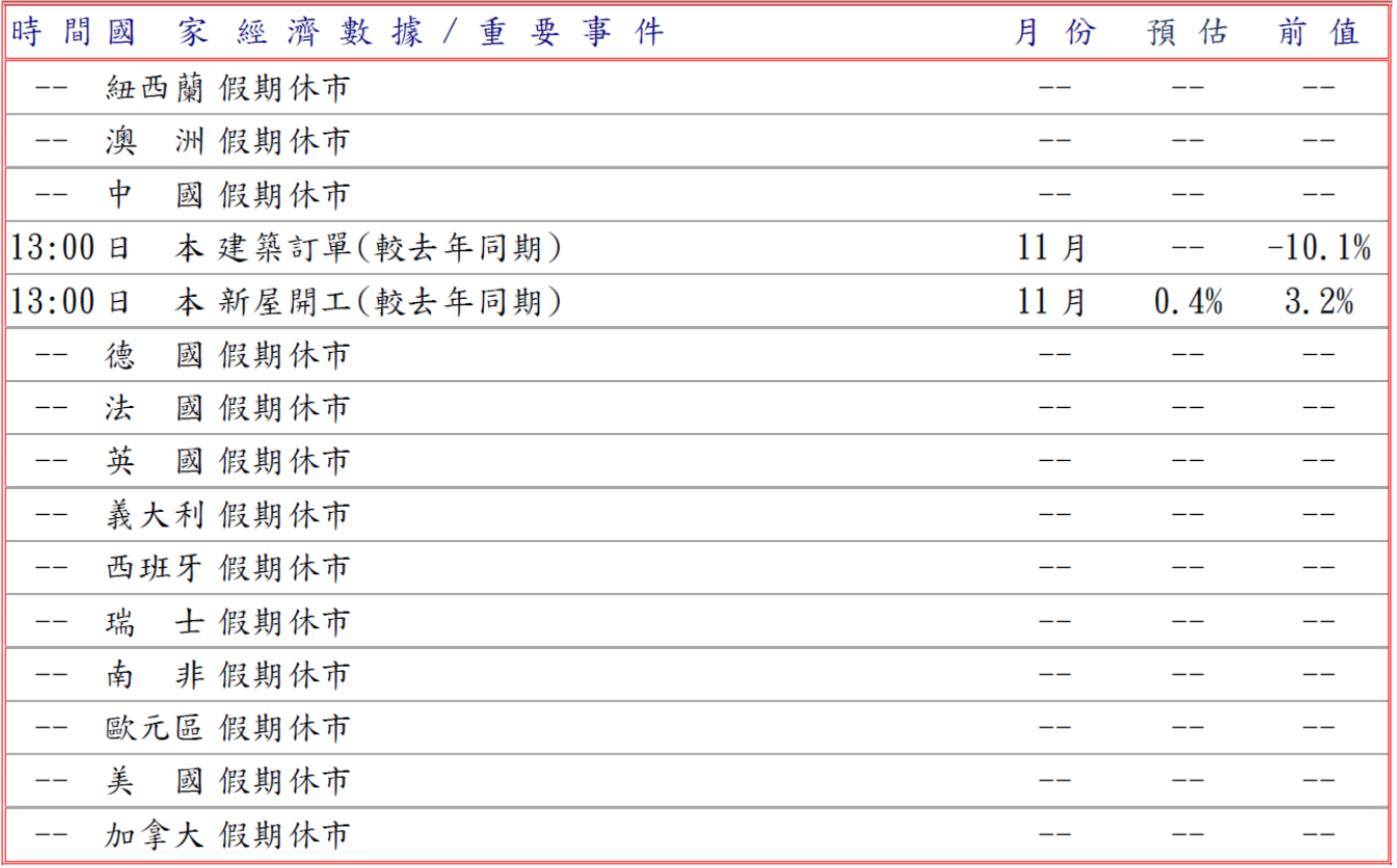據路透查閱一份草案顯示,日本計畫發行約1,890億美元新公債,為下一財政年創紀錄規模的預算籌措資金,突顯政府擴張性財政政策的立場,但兩名政府消息人士稱,日本下個財政年超長期新債發行量可能降至十七年來最低約17兆日圓,回應市場擔憂供給過剩引發超長債收益率推升至歷史新高,而且市場對日本當局採取干預措施阻止日圓下滑保持警惕,限制日圓走貶;此外,美國上周初請失業金人數意外降至21.4萬人,但招聘疲軟,12月失業率料維持高位,適逢許多國際市場迎來聖誕節假期休市令交投淡靜,打壓美元兌日圓至155.54低點。預估今日美元兌日圓阻力於155.90-156.10,支撐於155.00-20。