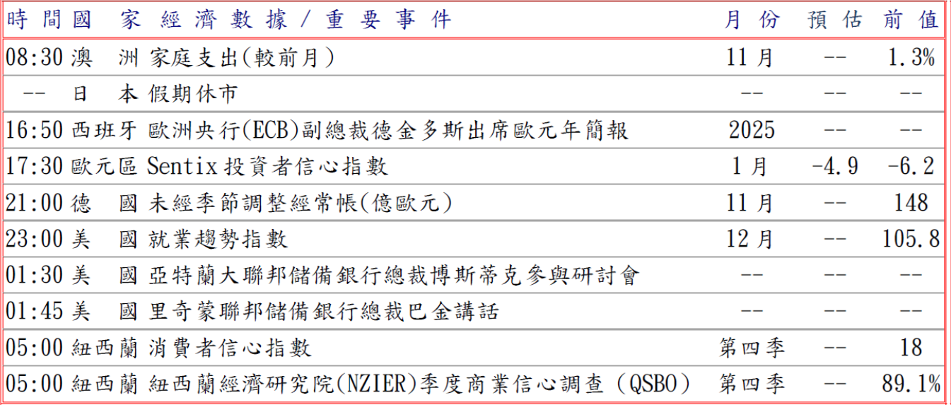 隨後美國勞工統計局公布12月就業數據顯示,非農業就業崗位增加5萬個不及預期,但失業率降至4.4%及平均所得較去年同期升3.8%高於預估值,為FED提供更多喘息空間,市場押注FED將等到6月再恢復降息,並據美國商務部表示,10月占住宅建設大部分的獨棟住宅開工量增加5.4%至經季節調整年率降至87.4萬戶,但建築許可減少0.2%至年率達141.2萬戶高於預期,而且密西根大學調查1月美國消費者信心指數初值升至54.0,推升美元兌日圓至158.18高點。預估美元兌日圓支撐於157.40-60,阻力於158.30-50。